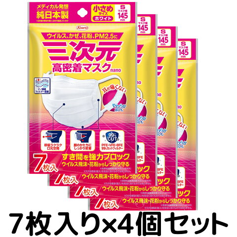 マスクサイズ:82mm×125mm こども用サイズ ls@KWS-D186三次元マスク 小さめ 高密着マスク ナノ 小さめSサイズ 7枚入り×4個セット コーワ 興和 日本製 耳が痛くならない ホワイト 抗菌 使い捨て サージカルマスク 花粉対策ナノ繊維フィルター搭載の高性能マスク。