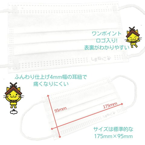 商品情報品名衛生マスク対象ウイルス飛沫、花粉、ハウスダスト等素材本体・フィルター部:ポリプロピレン耳ひも部:ポリエステルワイヤー:ポリエチレン枚数300枚(50枚×6箱)サイズ175×95mm製造・販売者名山陽物産株式会社包装材外箱:紙内袋:ポリエチレン300枚 【 ご当地 マスク 】 しまねっこ 3層 不織布マスク 白色 日本製 立体 プリーツ ふつうサイズ 大人 ワンポイント かわいい ゆるキャラ 島根 さらっと触感 呼吸しやすい 耳が痛くならない 高機能 国産マスク 使い捨てマスク 自社工場生産 50枚×6箱 可愛い島根県ご当地のキャラクター「しまねっこ」のワンポイント刻印入り。